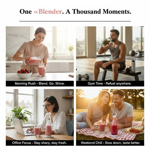 Our portable blender lets you make smoothies, shakes, cocktails anytime, anywhere.
